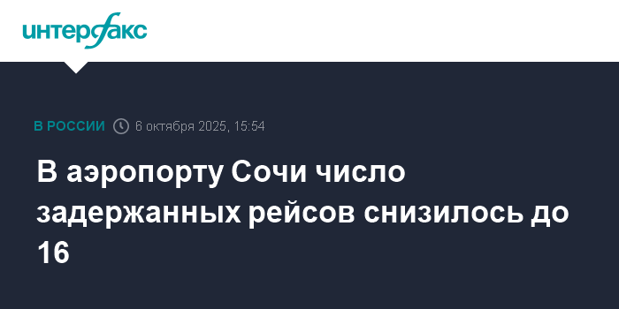 Москва. 6 октября. INTERFAX.RU - В международном аэропорту Сочи к 14:20 по московскому времени количество задержанных на вылет рейсов сократилось до 16, сообщает телеграм-канал предприятия.