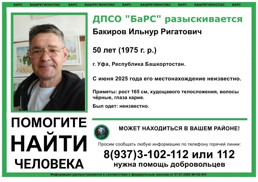 Ильнур Бакиров из Уфы пропал без вести в июне 2025 года, информирует ДПСО «БаРС». Приметы 50-летнего жителя — рост 165 см, худощавое телосложение, черные волосы, карие глаза.