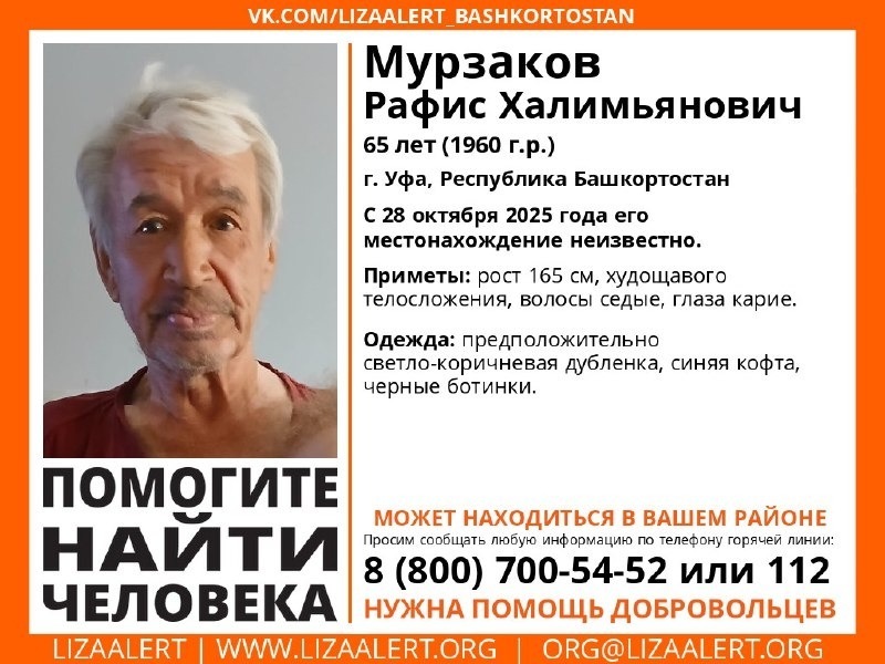 Поиски 65-летнего мужчины ведутся с 28 октября. По данным отряда «Лиза Алерт РБ», мужчина предположительно был одет в светло-коричневую дубленку, синюю кофту и черные ботинки.