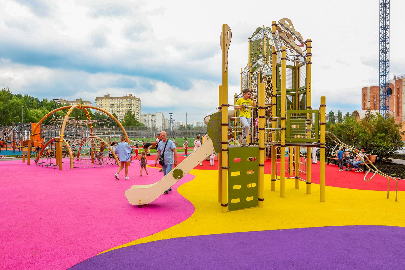 В Северном Бутове на юго-западе столицы в рамках благоустройства нового спортивного сквера появилась большая детская площадка. Ее выполнили в современном экостиле, гармонично вписывающемся в природный ландшафт территории. На ярком покрытии расположены многоуровневые башни и игровые модули с декоративными панелями, горками разной конфигурации, веревочными лазилками и сетчатыми куполами для тренировки ловкости.