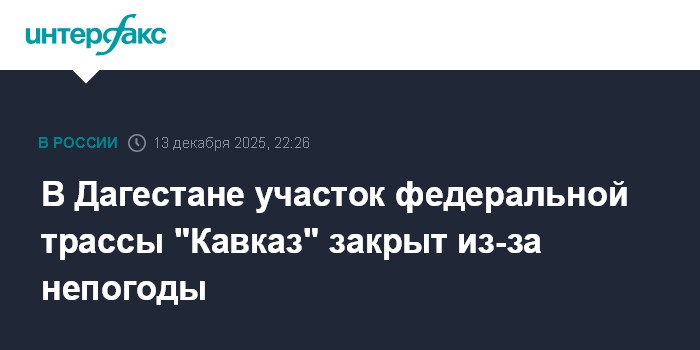Москва. 13 декабря. INTERFAX.RU - Проезд автотранспорта временно запрещен на участке федеральной трассы "Кавказ" возле Махачкалы из-за непогоды, сообщает Госавтоинспекция республики в субботу в своем телеграм-канале.