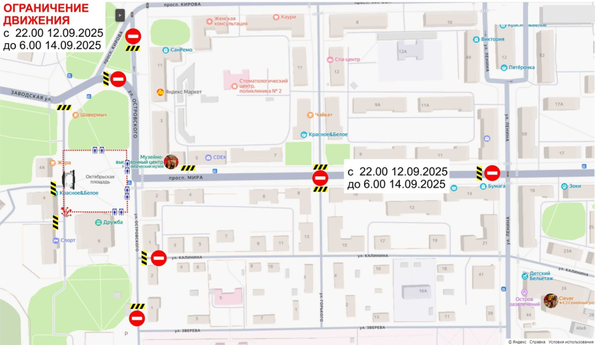 с 22:00 12 сентября до 6:00 14 сентября будет запрещено движение транспорта на Мира (от дома №14 до дома №7 по Островского) и Островского (от Кирова до Зверева и от Заводской до футбольного поля №1). с 7:00 до 12:00 13 сентября нельзя будет проехать по Первомайской (от Кирова до Вятской Набережной) и Вятской Набережной (от Первомайской до Ленина).Отметим, что на вышеуказанных участках также будет запрещена остановка и стоянка транспорта.