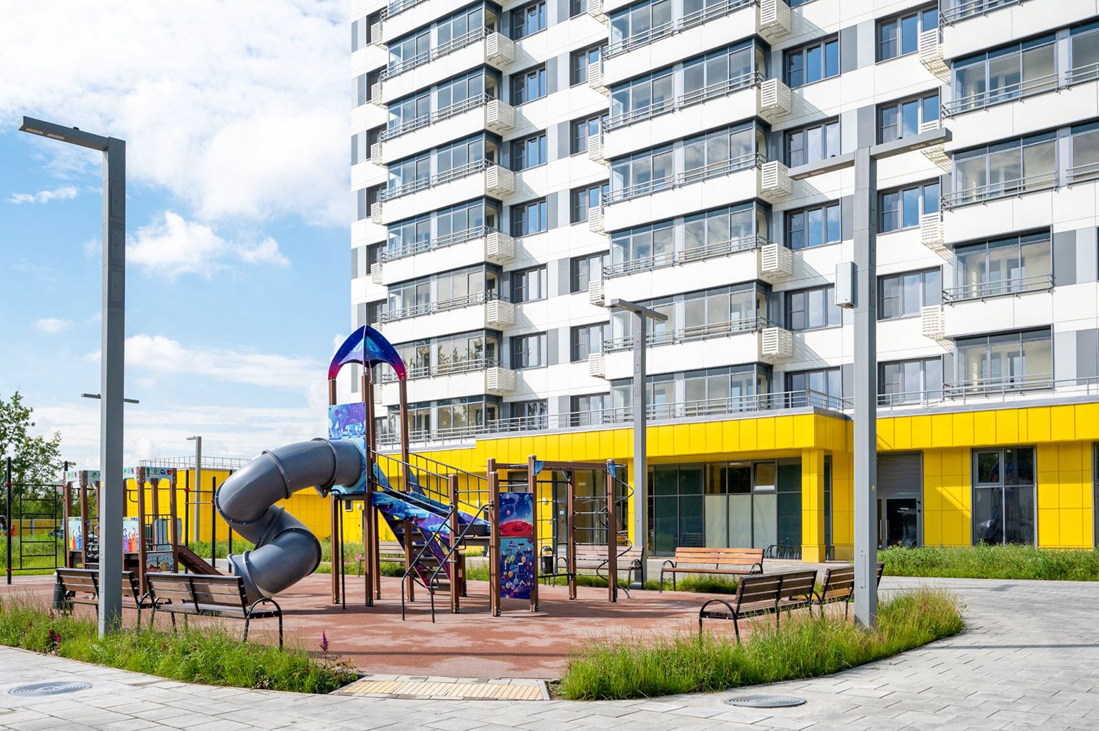 В новых жилых комплексах в Донском районе создали безбарьерную среду, оборудовали детские и спортивные площадки, а территорию рядом с домом благоустроили.