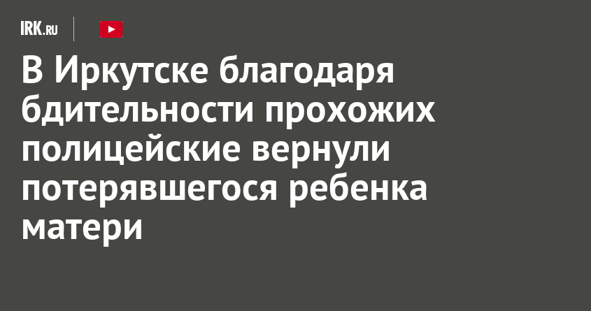24 августа в Иркутске две местные жительницы обнаружили трехлетнего мальчика вблизи проезжей части в районе одного из торговых центров. Ребенок был один и ехал вдоль дороги на игрушечной машинке. Женщины сообщили об этом в полицию и оставались рядом с мальчиком до приезда правоохранителей, сообщили в пресс-службе ГУ МВД России по Иркутской области.