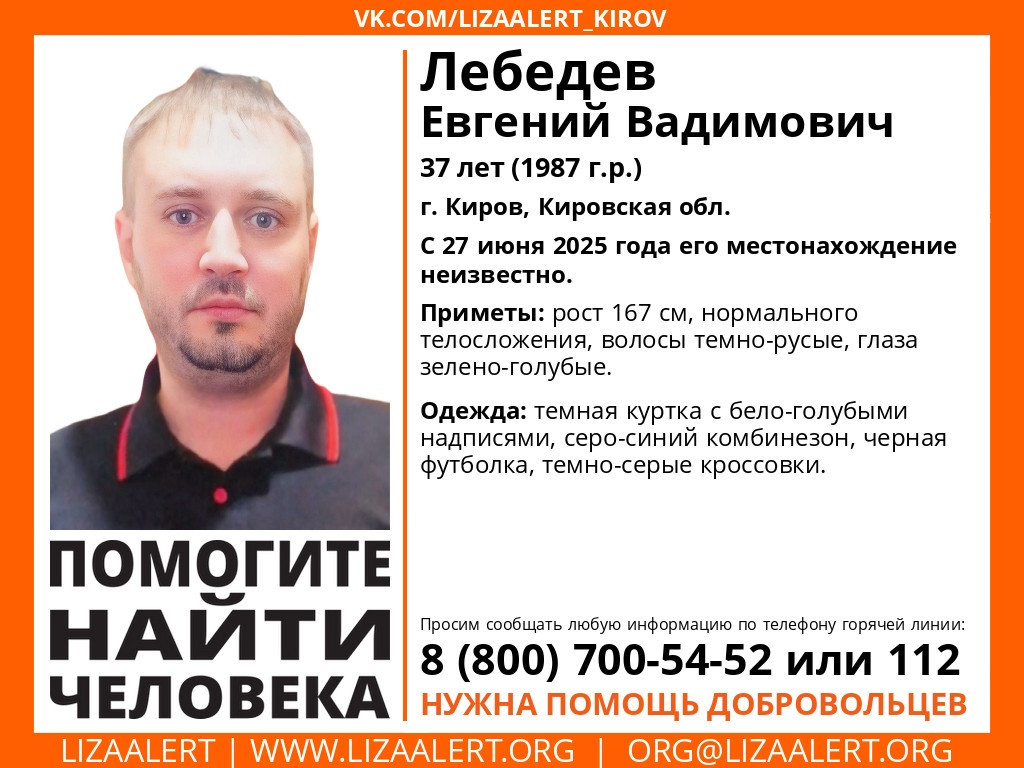В Кирове пропал 37-летний Евгений Вадимович Лебедев. Местонахождение мужчины неизвестно с 27 июня.