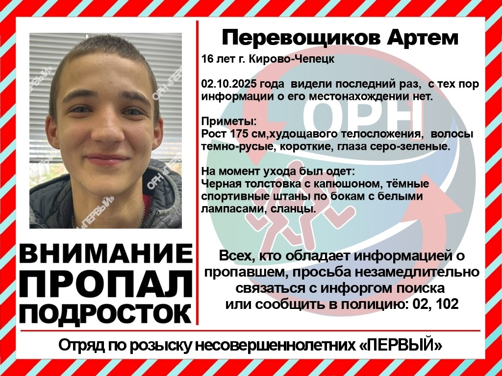 В Кирово-Чепецке пропал без вести 16-летний Артем Перевощиков. Последний раз его видели 2 октября.