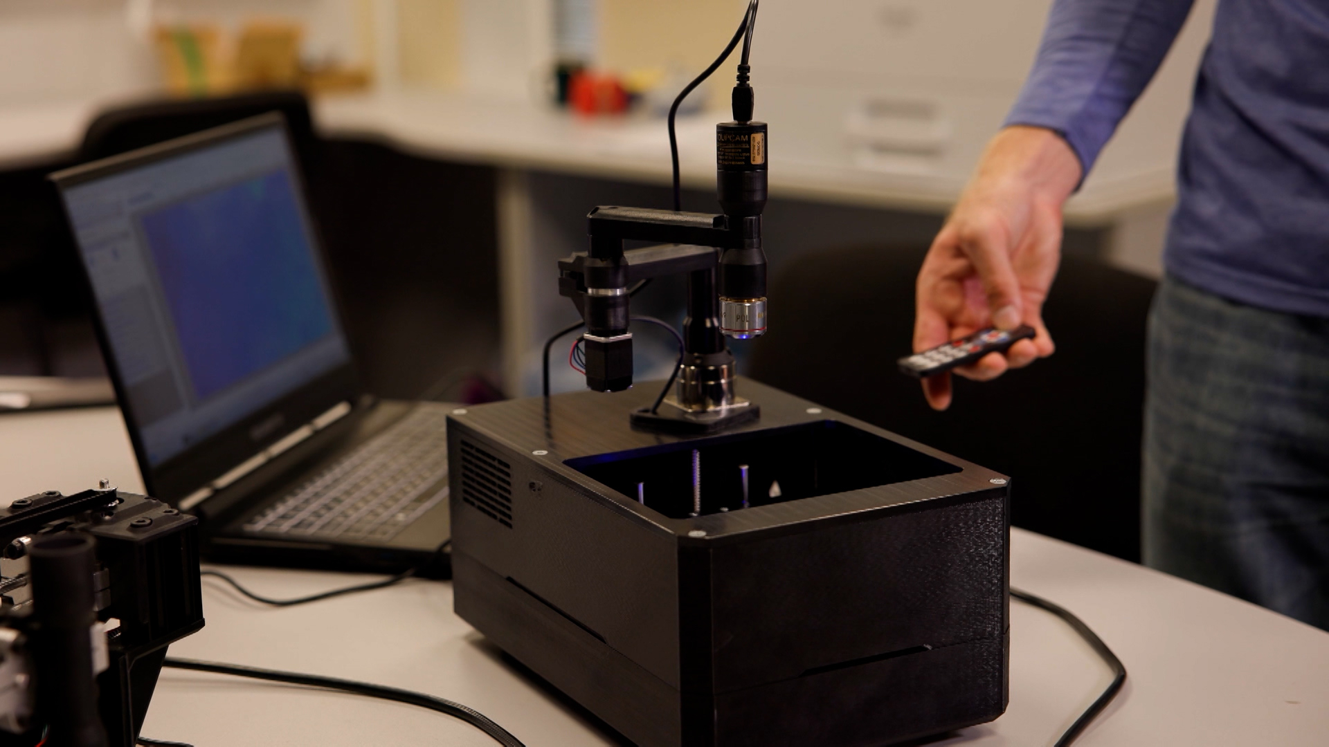 В основе умного микроскопа манипулятор, который может перемещать специальную видеокамеру с высоким разрешением вдоль и поперек предметного стола с биоматериалами. Клетки подсвечиваются волнами разной длины — синим, зеленым и ультрафиолетовым — так проще визуализировать определённые белки в клеточных культурах. Дальше изображение анализирует робот.