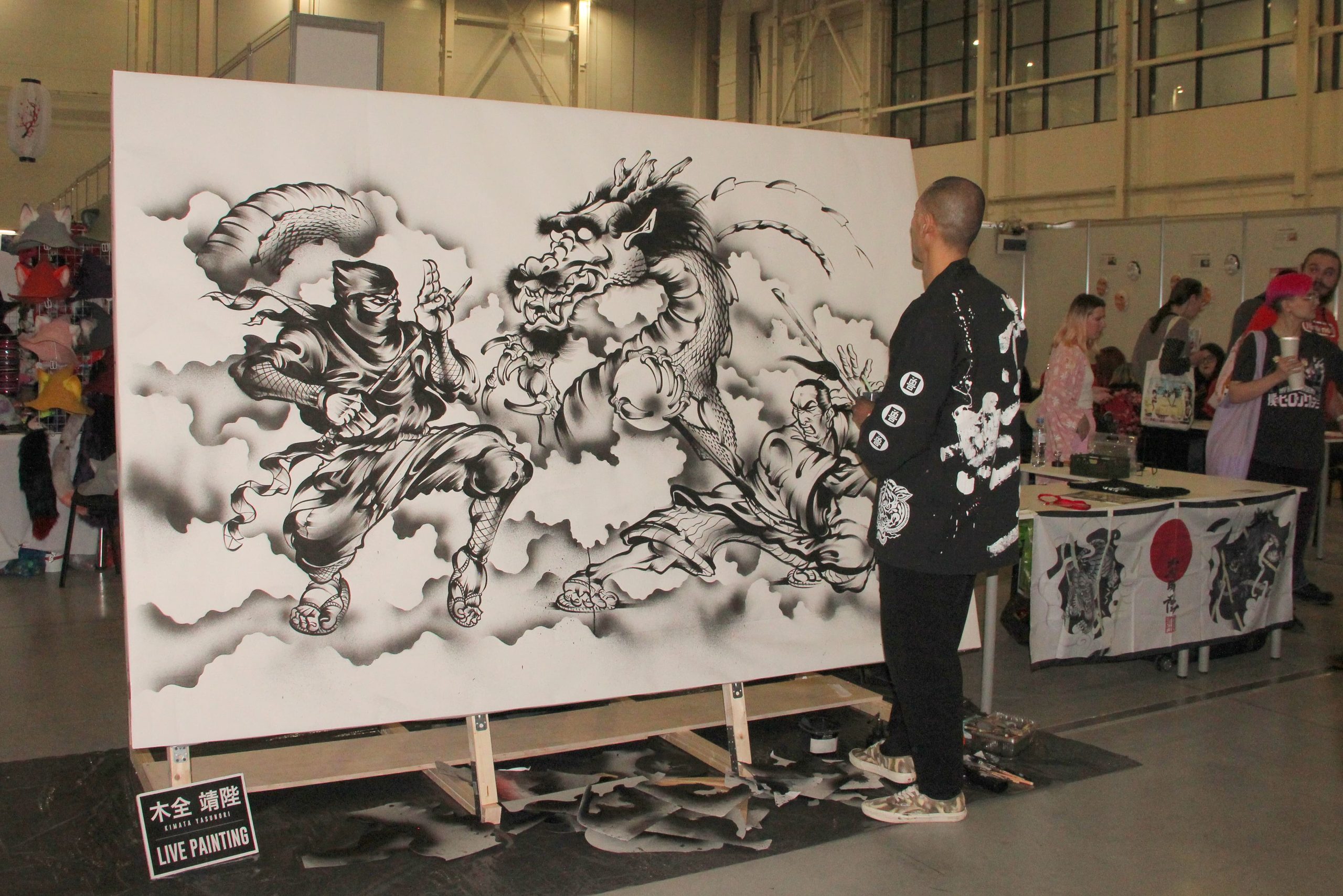 Оригинальный жанр представлял Enishi – артист мгновенной смены лиц. Весь день огромный рисунок с бойцами и драконами изображал на глазах публики Ясунори Кимата – современный художник, который объединяет традиционную технику тушевой живописи и яркий стрит-арт. Он же проводил мастер-классы по рисунку для всех желающих.