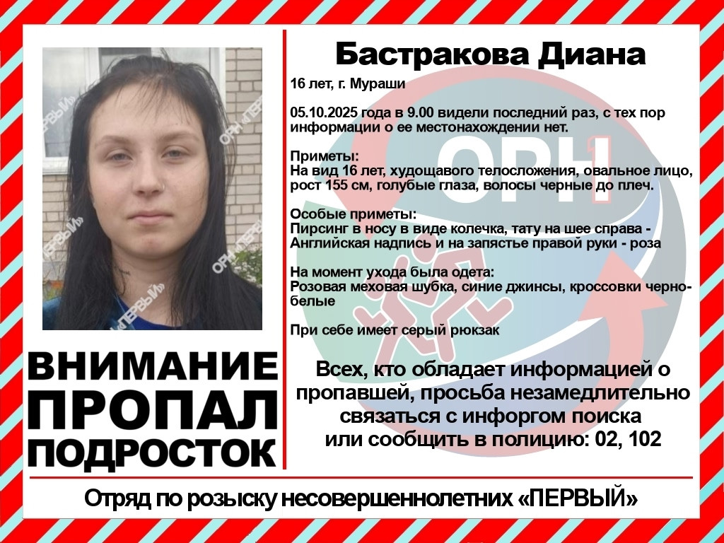 В Мурашах разыскивают 16-летнюю Диану Бастракову. В последний раз ее видели 5 октября около девяти часов утра. После этого связь с ней пропала.