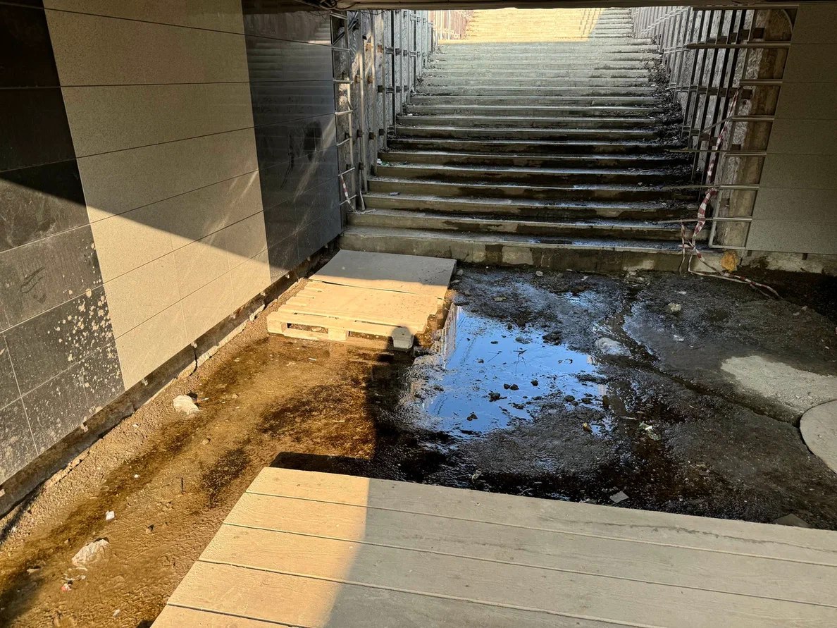 Ремонт многострадального подземного перехода на Проспекте Победы снова затягивается на неопределенный срок, а объект продолжает оставаться в разрухе. Во время ливней его топит, и горожане вынуждены мочить ноги и рисковать здоровьем, чтобы перейти через дорогу.