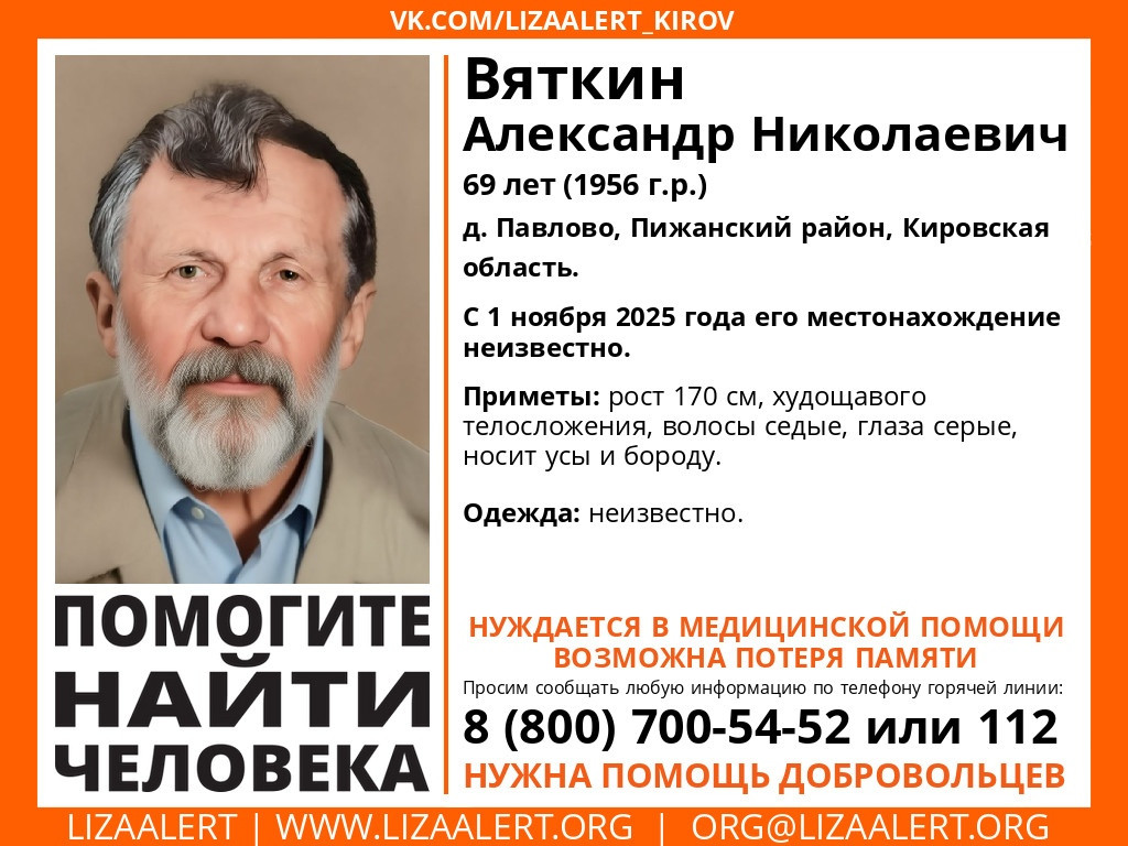 Отряд «Лиза Алерт» сообщил о поисках 69-летнего Вяткина Александра Николаевича. Мужчина пропал 1 ноября в деревне Павлово Пижанского района.