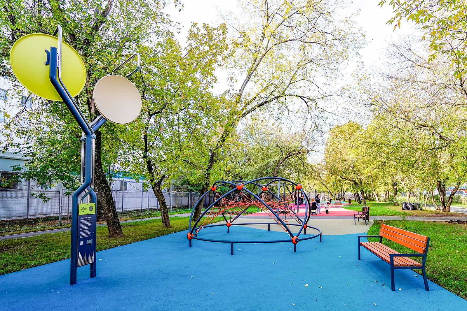 Вместо устаревшей детской площадки создали современную игровую зону. Здесь разместили необычные городки с разнообразными горками, переходами и лазилками для тренировки координации и ловкости, установили качели-гнезда и балансиры, сделали батуты. Чтобы активные игры стали безопаснее, во всей игровой зоне уложили резиновое покрытие. Для юных творцов и исследователей установили стилофон, а также модули «Слушай город» и «Плавучий маяк».