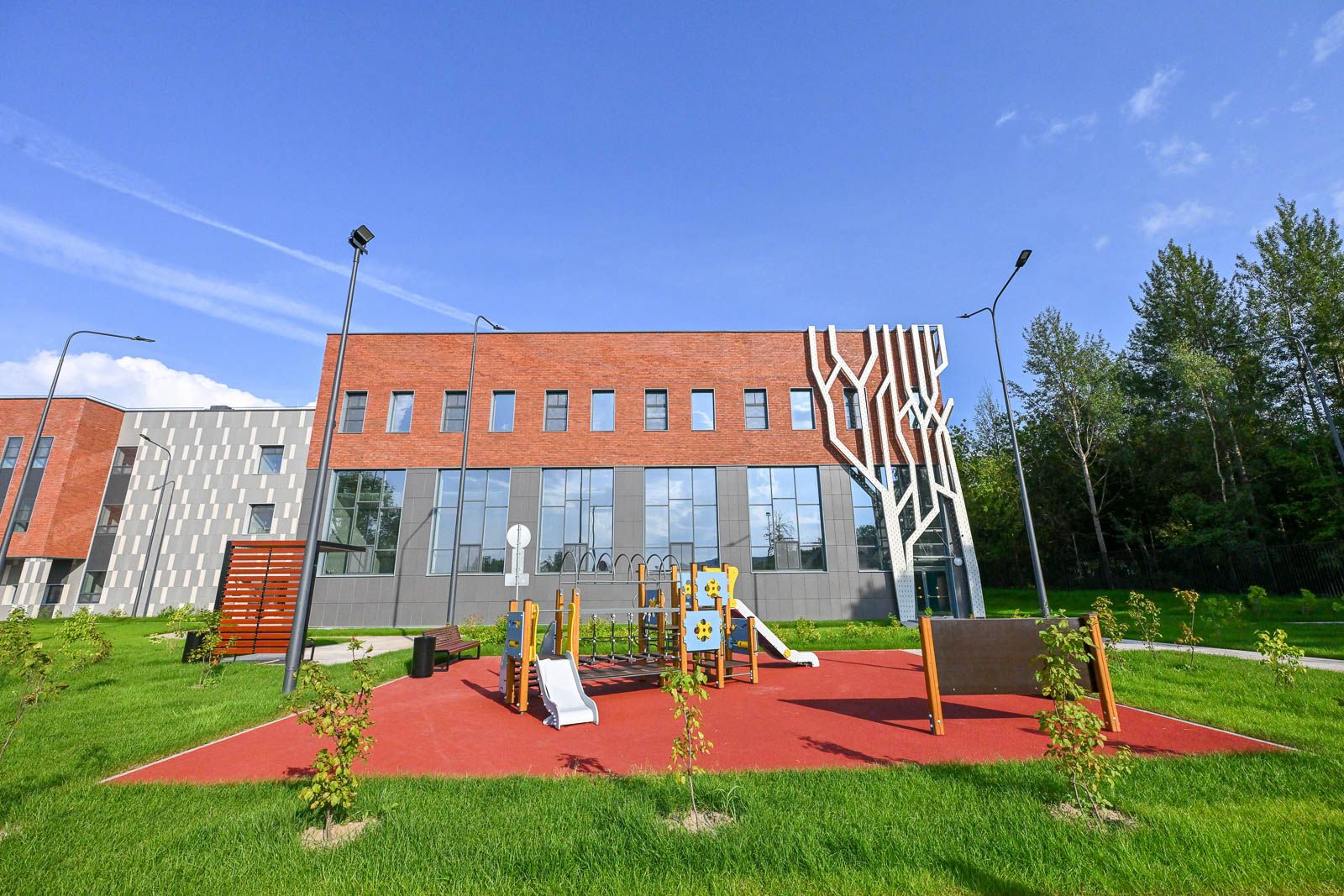 Территорию рядом с корпусом благоустроили: сделали площадки для подвижных игр и мероприятий, провели озеленение, оборудовали спортивную зону, а также установили малые архитектурные формы.