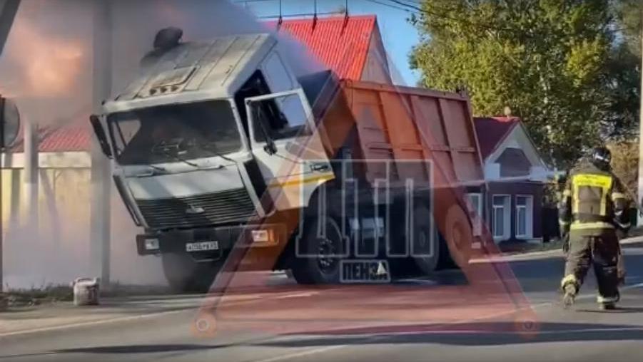 На кадрах запечатлен горящий самосвал «МАЗ», который тушат пожарные.