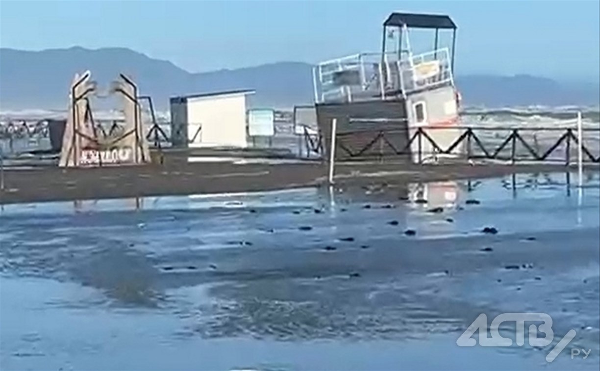 Покосились или упали информационные аншлаги, ограждения, накренилась будка спасателей, снесло пляжные дорожки и причал. Весь пляж пока залит морской водой и занесен мусором.