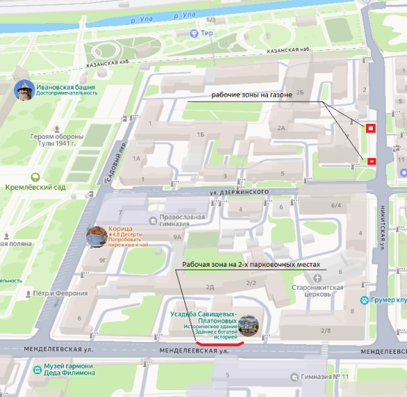 Остановка и стоянка транспорта будут запрещены с 00:00 1 ноября до 23:59 4 ноября на парковочных местах у здания по адресу ул. Менделеевская, 2 (усадьба Савищевых-Платоновых). Работы будут проводиться одновременно на улицах Менделеевской и Никитской.