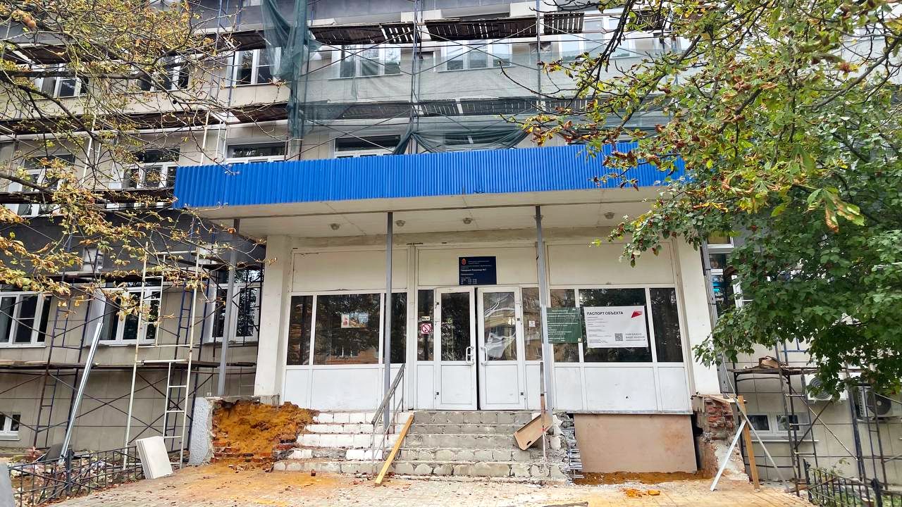 Пока идёт ремонт, медицинскую помощь жители получают в уже отремонтированной части здания. Сейчас в половине здания поликлиники демонтировали и заменили оконные блоки, системы отопления и водоснабжения, а также электропроводку. Полностью выполнены отделочные работы, смонтирована система приточной и вытяжной вентиляции, отремонтирована кровля и облицована часть фасада здания. В другой половине здания пока демонтированы и заменены системы отопления и электрики.