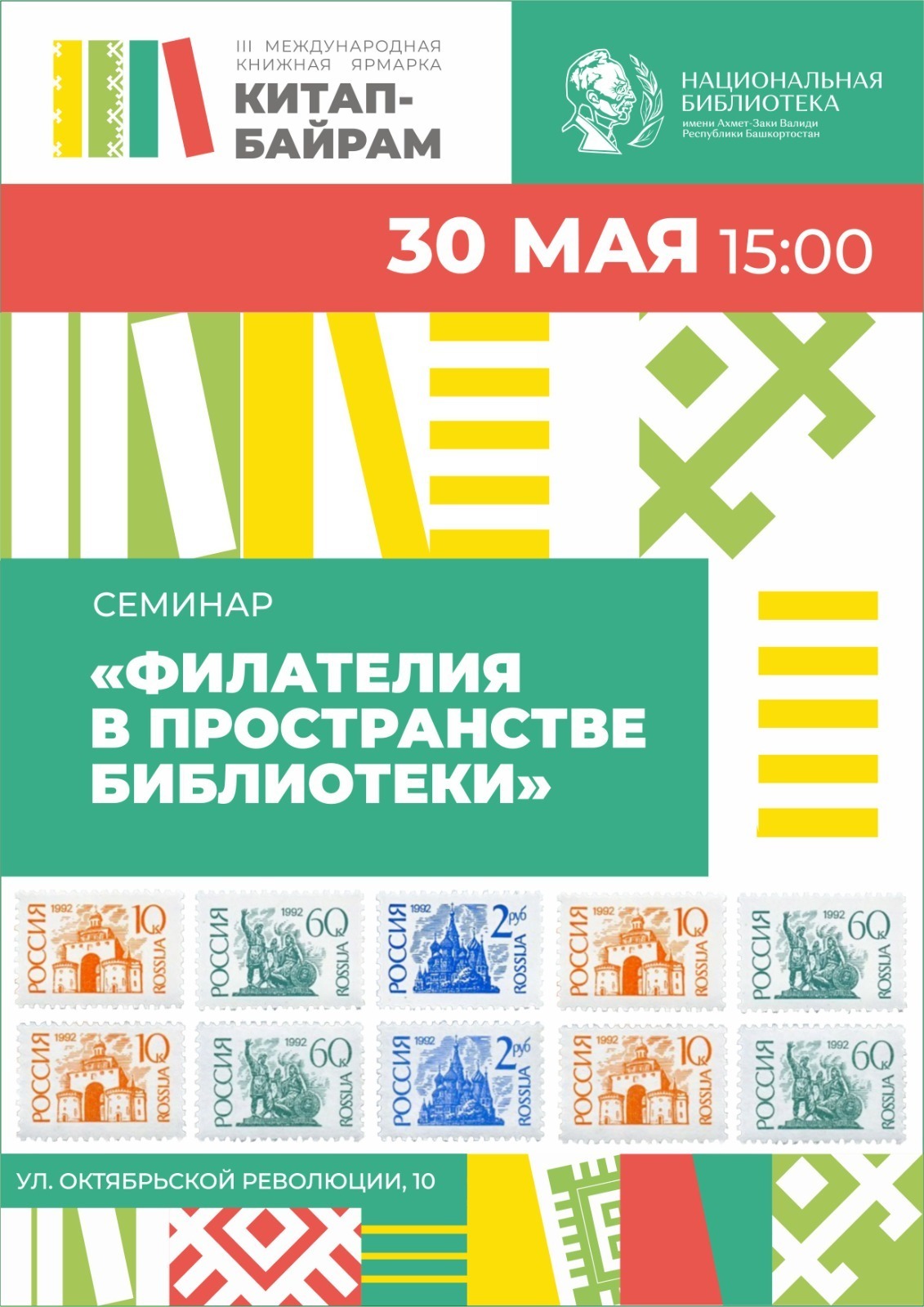 В рамках II Международной книжной ярмарки «Китап-Байрам» в Уфе состоится семинар, посвященный филателии. В Национальной библиотеке имени Ахмет-Заки Валиди Республики Башкортостан 30 мая автор и издатель каталогов почтовых марок Гурген Кочарян поделится опытом проведения мероприятий для детей с использованием марок, а также о том, как заинтересовать ребенка филателией.