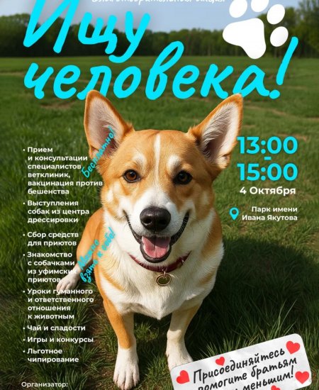 В этот раз благотворительная акция «Ищу человека» состоится 4 октября в парке имени Ивана Якутова с 13 до 15 часов.В программе: знакомство с собаками из уфимских приютов, уроки ответственного и гуманного отношения к животным, игры и конкурсы.Организован бесплатный приём и консультации ветеринаров, вакцинация против бешенства и льготное чипирование.Собаки из центра дрессировки покажут свои умения.Также традиционно проводится сбор помощи для приютов.