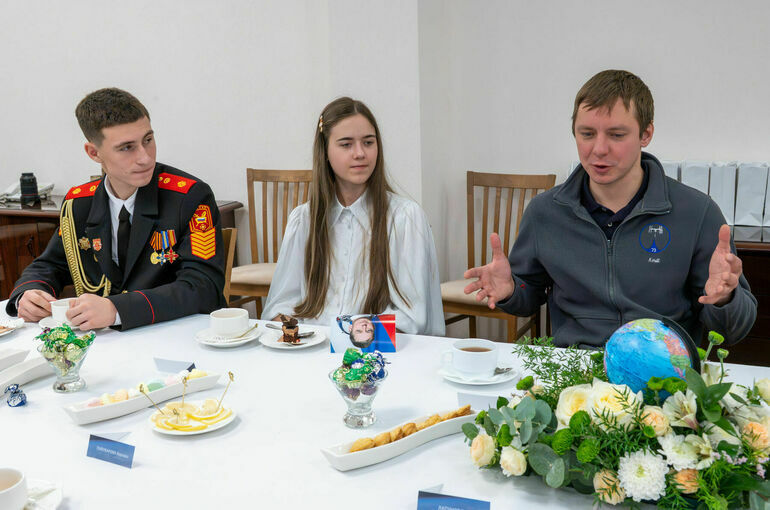 Затем за чашкой чая Кирилл Песков ответил на вопросы. Школьники спрашивали о подготовке к полету, о невесомости, режиме дня, быте на МКС, перспективах освоения Луны, адаптации после возвращения и даже о любимой книге космонавта.