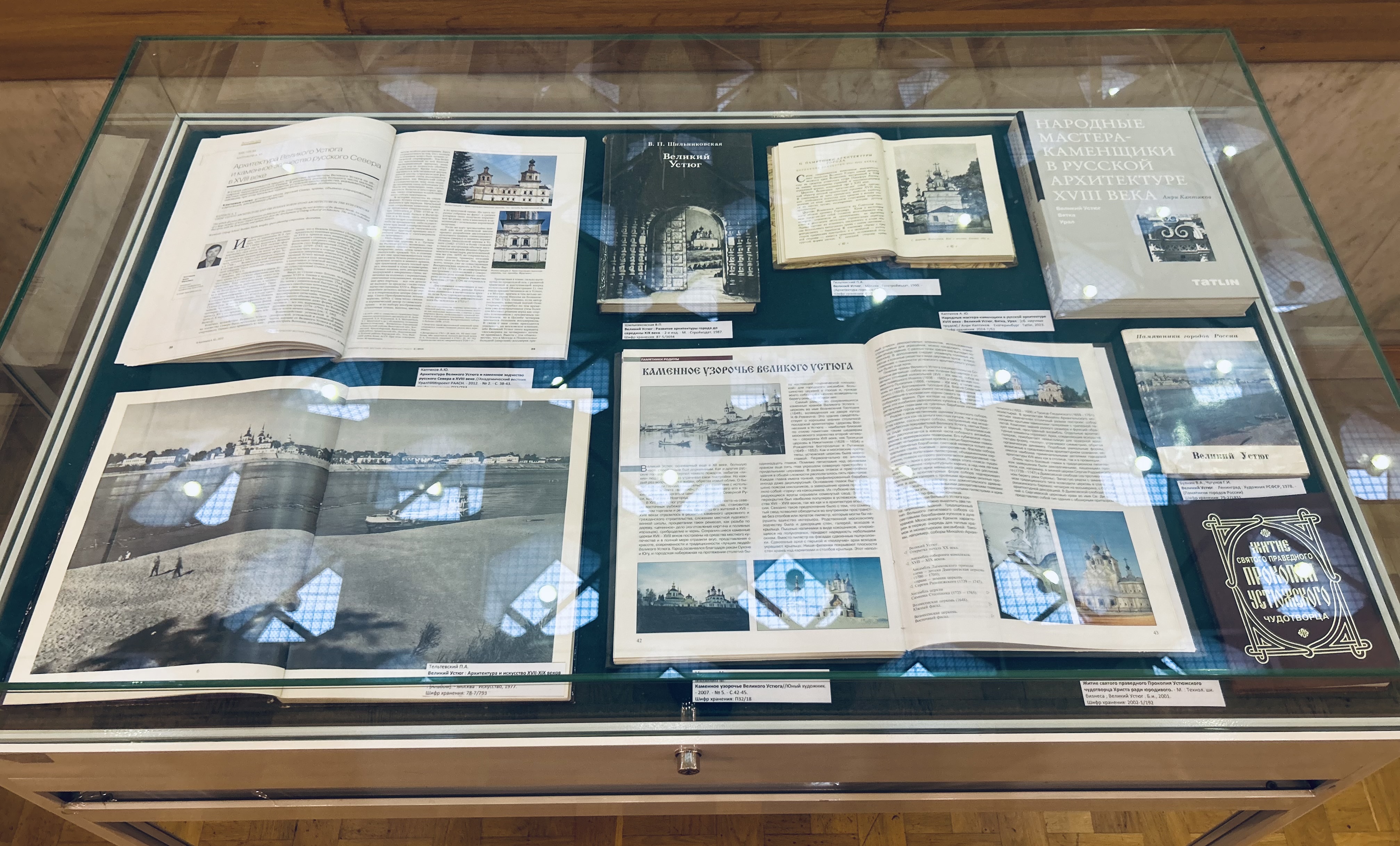 В числе экспонатов представлены работы, охватывающие разные периоды истории города: «Великий Устюг в открытках начала XX века» (2016 г.), «Великий Устюг: Развитие архитектуры города до середины XIX века» (1987 г.), «Великий Устюг – центр художественной культуры Русского Севера XIII-XVIII веков» (2018 г.) и другие.