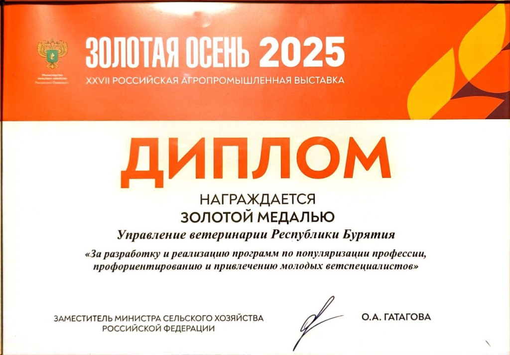 Кроме этого, управление ветеринарии Бурятии стало золотым медалистом Российской агропромышленной выставки. Награда присуждена за разработку и реализацию программ по популяризации профессии и привлечению молодых специалистов.