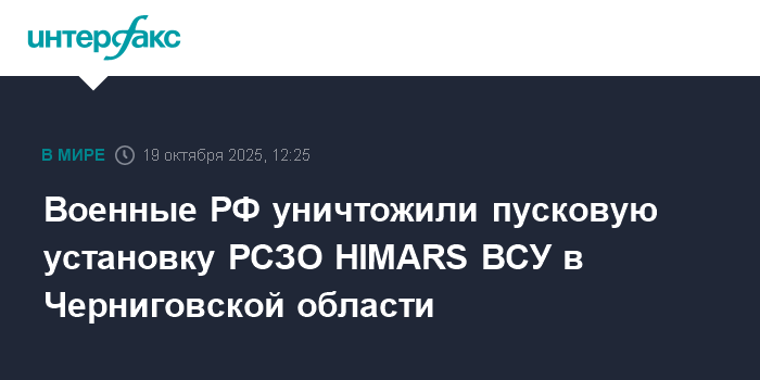 Москва. 19 октября. INTERFAX.RU - Российские военные заявили, что нанесен ракетный удар комплексом "Искандер-М" по месту стоянки реактивной системы залпового огня (РСЗО) HIMARS ВСУ в районе села Кузьминское в Черниговской области в 18 км от госграницы РФ.
