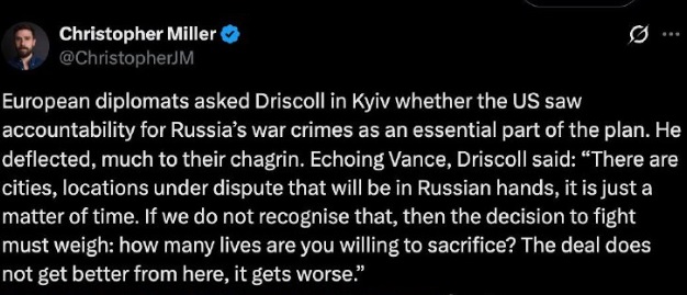 «Есть города и спорные территории, которые перейдут в руки России, это лишь вопрос времени. Если мы этого не признаем, то решение о войне должно быть взвешено: сколькими жизнями вы готовы пожертвовать? С этого момента ситуация не улучшится, а ухудшится», — сказал Дрисколл западным дипломатам, пишет Миллер.Как передавало EADaily, Киев, судя по всему, выдвинет последнее требование на ближайших переговорах в США. Об этом заявил в соцсети Х аналитик венгерского Центра фундаментальных прав Золтан Кошкович.
