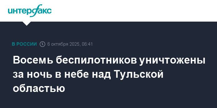Москва. 6 октября. INTERFAX.RU - Губернатор Тульской области Дмитрий Миляев сообщил о ликвидации восьми БПЛА над регионом в ночь на понедельник.