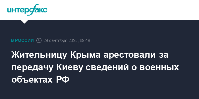 Москва. 29 сентября. INTERFAX.RU - Жительница Крыма задержана и арестована за передачу украинской разведке сведений о российских военных объектах, в том числе местах дислокации кораблей Черноморского флота, сообщил в понедельник Центр общественных связей (ЦОС) ФСБ РФ.