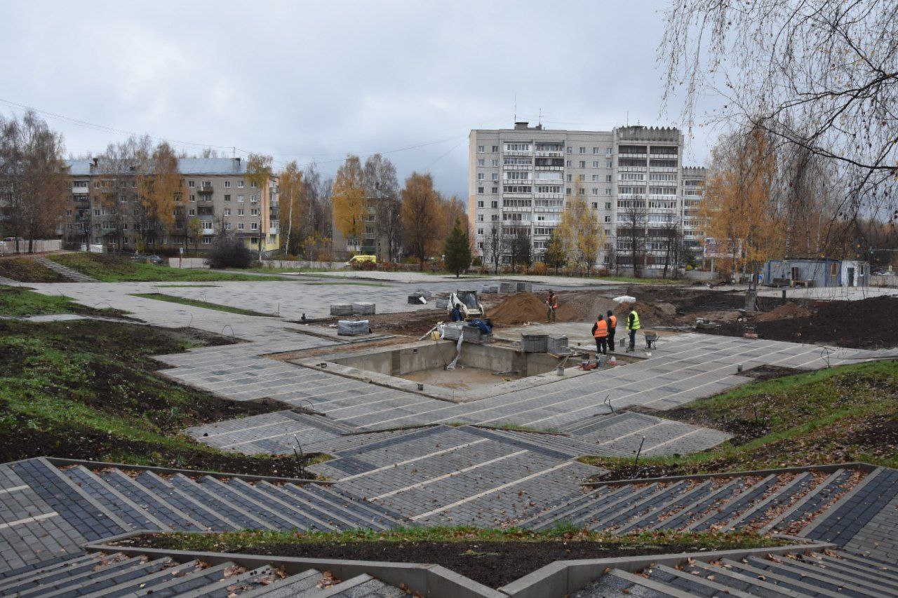 По словам подрядчика, в сквере сделали самые сложные этапы: привели в порядок лестницы, проложили коммуникации, на 80 процентов завершили работу с пешеходными дорожками, подготовили места для установки фонарей, забетонировали игровую, спортивную площадки и основание под «сухой» фонтан — такой же, как у цирка.