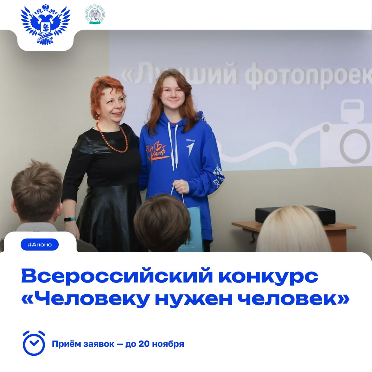 Всероссийский конкурс школьных журналистских работ «Человеку нужен человек» — это возможность поделиться своими идеями и мыслями по важным социальным вопросам, таким как волонтёрство, межнациональная дружба, талантливые люди, связь поколений, инклюзивное образование и др.