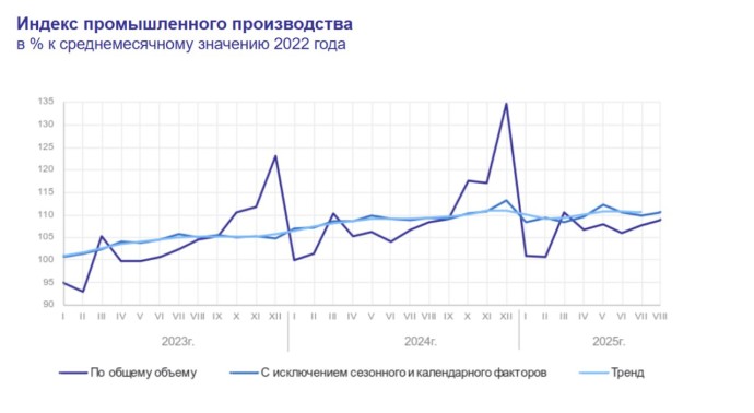 Росстат фиксирует умеренный рост: в январе–августе промышленное производство составило 100,8% к прошлому году, в августе к июлю — плюс 1,2%. Формально динамика положительная, но крайне неравномерная.