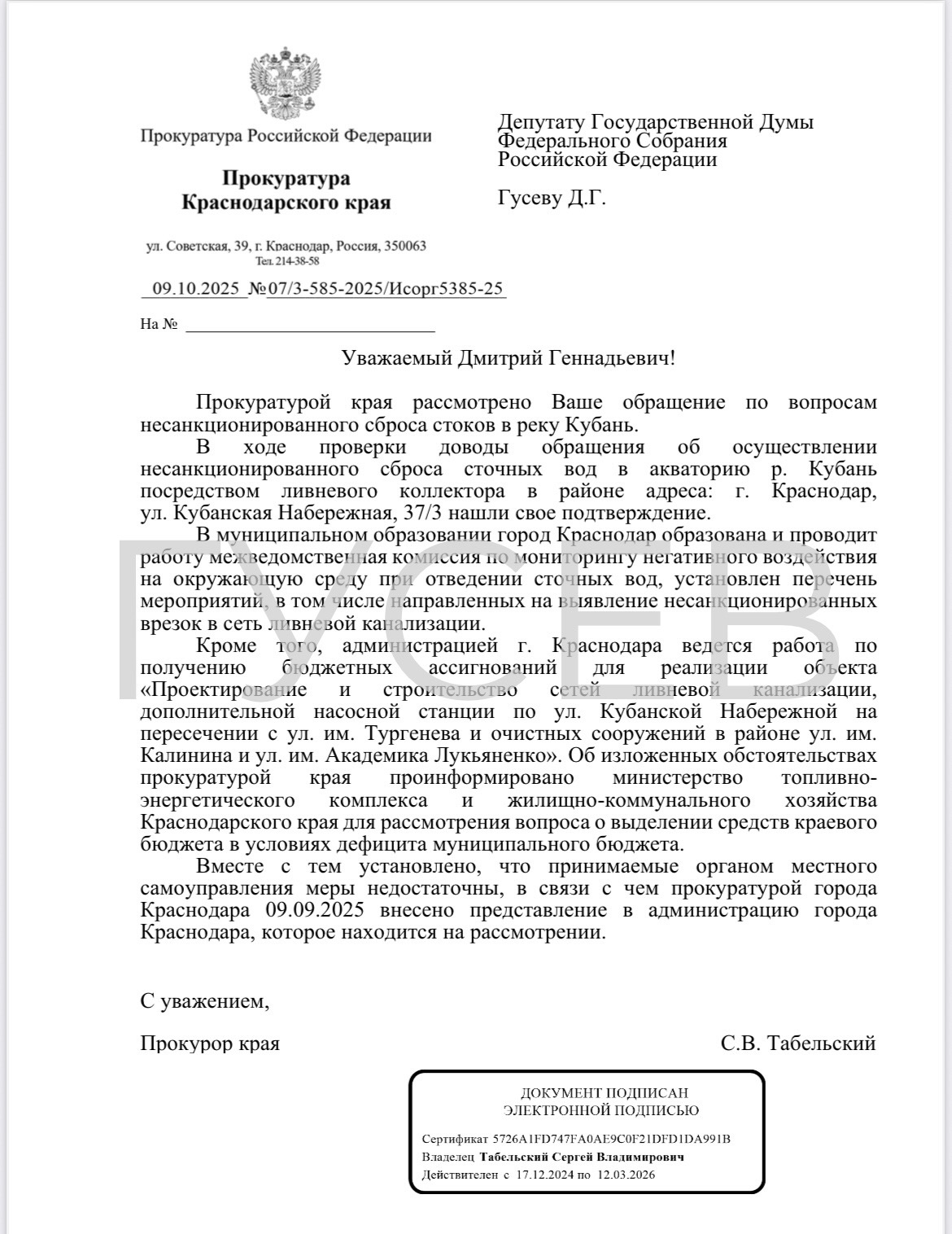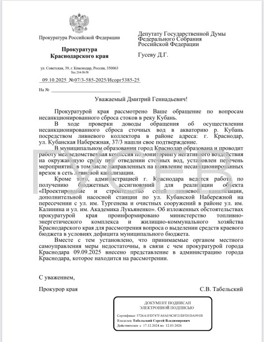 После нашего с коллегой депутатского запроса Прокуратура Краснодарского края провела проверку и подтвердила факт несанкционированного сброса сточных вод в акваторию реки Кубань в районе улицы Кубанская Набережная, 37/3.