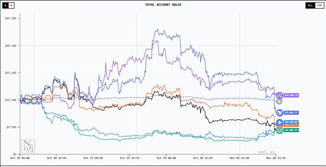 Из данных ей $10 тысяч нейросеть потеряла более 60% капитала, оставшись примерно с $3,7 тысячами. В то же время в плюс смогли выйти только DeepSeek 3.1, увеличивший капитал на 5%, и Qwen3-Max, поднявший сумму более чем на 20%.